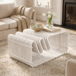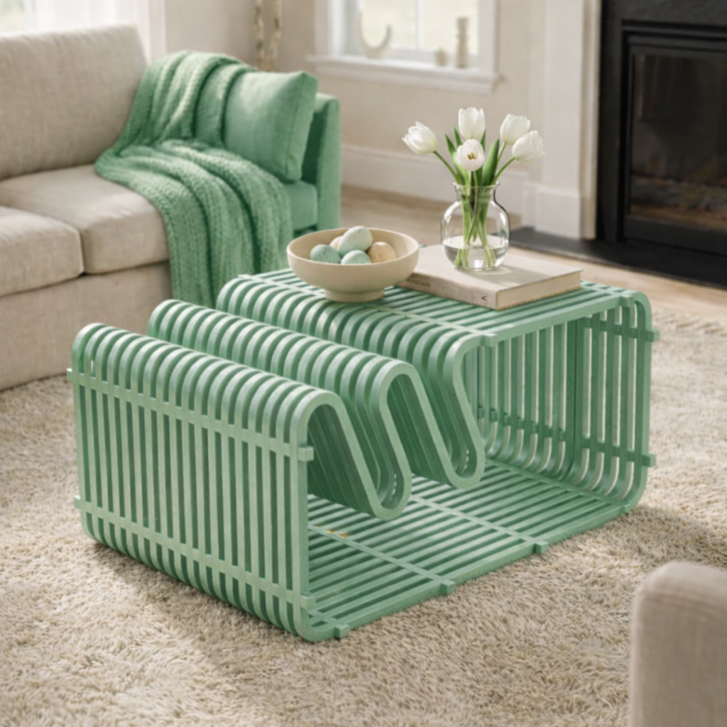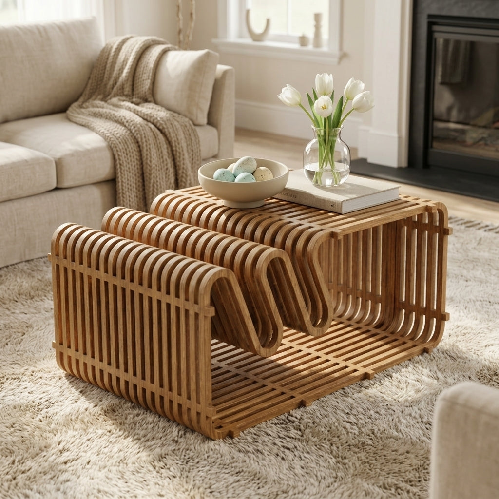 Premium Sculptural Design – Elevate your living space with this modern curved wooden Coffee table, featuring a unique slatted parametric structure that blends art with functionality.