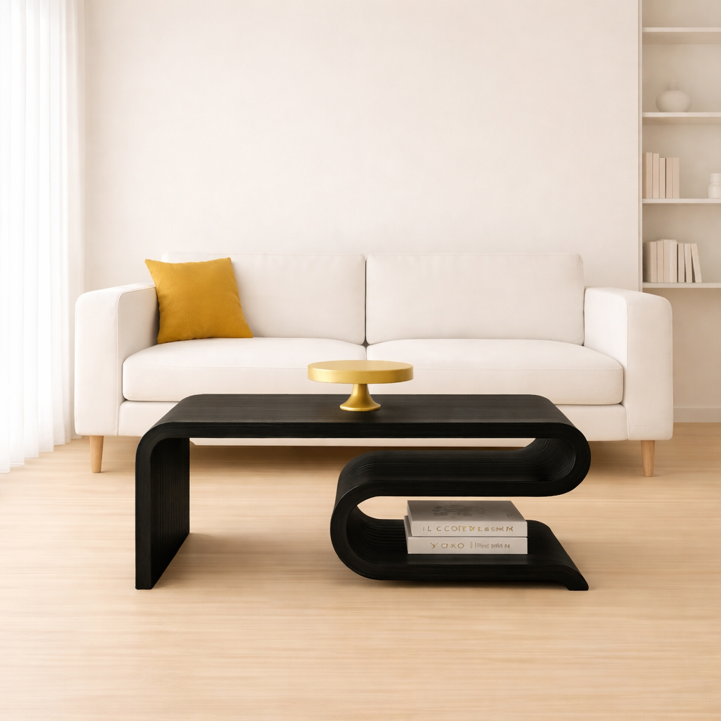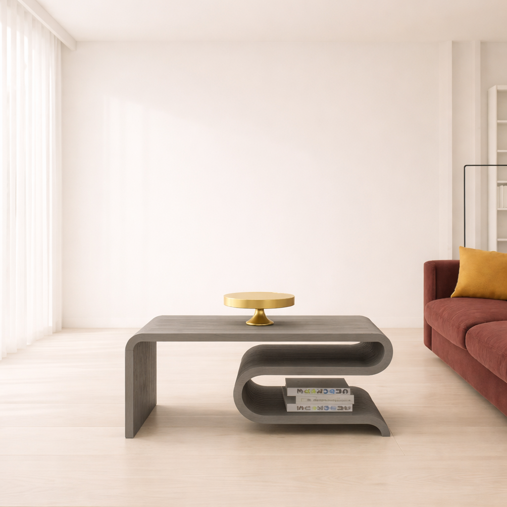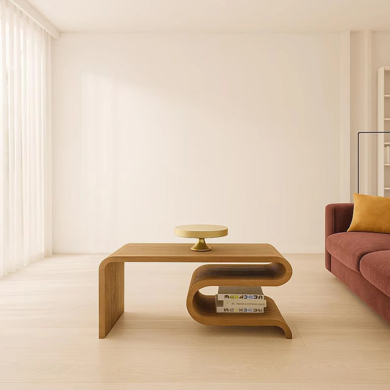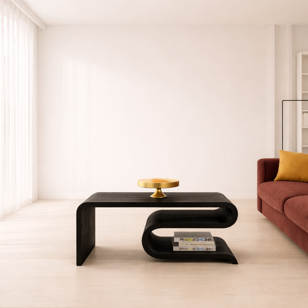 Modern Designer Coffee Table – Enhance your home with this premium curved wooden coffee table featuring a sleek flowing design and elegant finish.