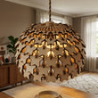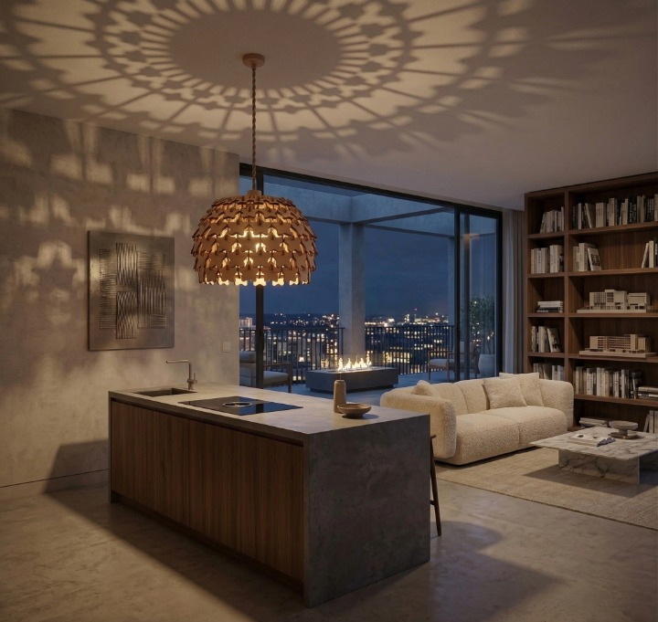 Stylish wooden chandelier spreads warm ambient light and enhances the overall atmosphere. Ideal for cozy, aesthetic, and modern interiors.