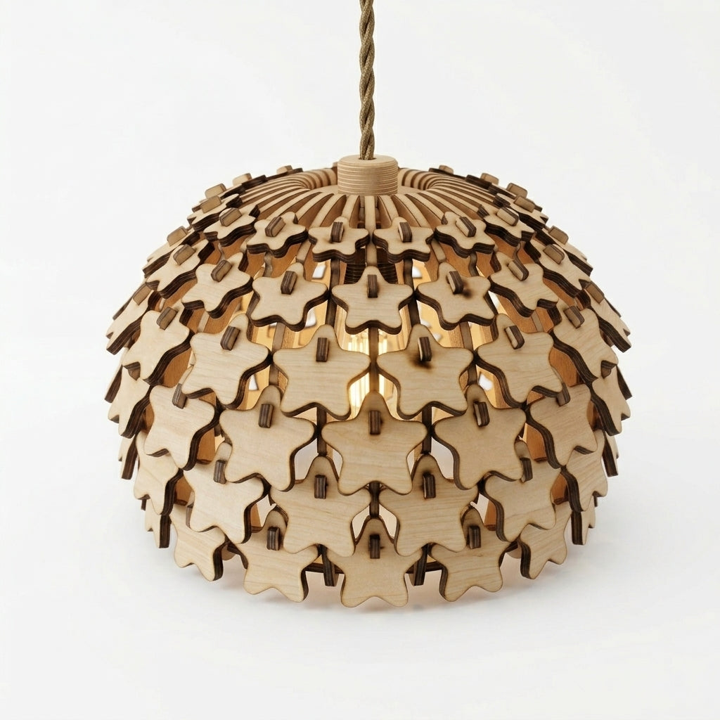 Elegant wooden pendant lamp with a unique layered geometric design that creates beautiful shadow patterns. Perfect for adding a luxury and modern touch to your living space.